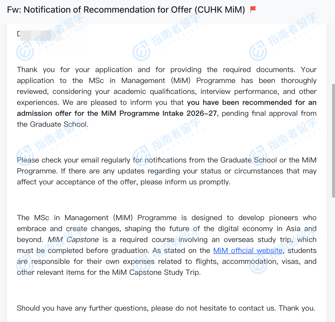 香港中文大學(xué)管理學(xué)理學(xué)碩士研究生offer一枚