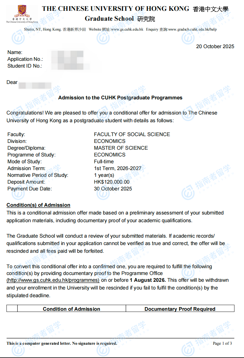 香港中文大學經(jīng)濟學理學碩士研究生offer一枚