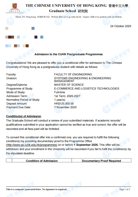 香港中文大學(xué)電子商務(wù)與物流技術(shù)理學(xué)碩士研究生offer一枚