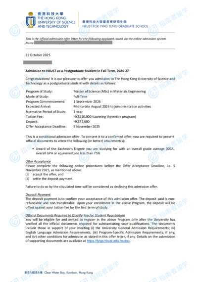 香港科技大學(xué)材料工程理學(xué)碩士研究生offer一枚
