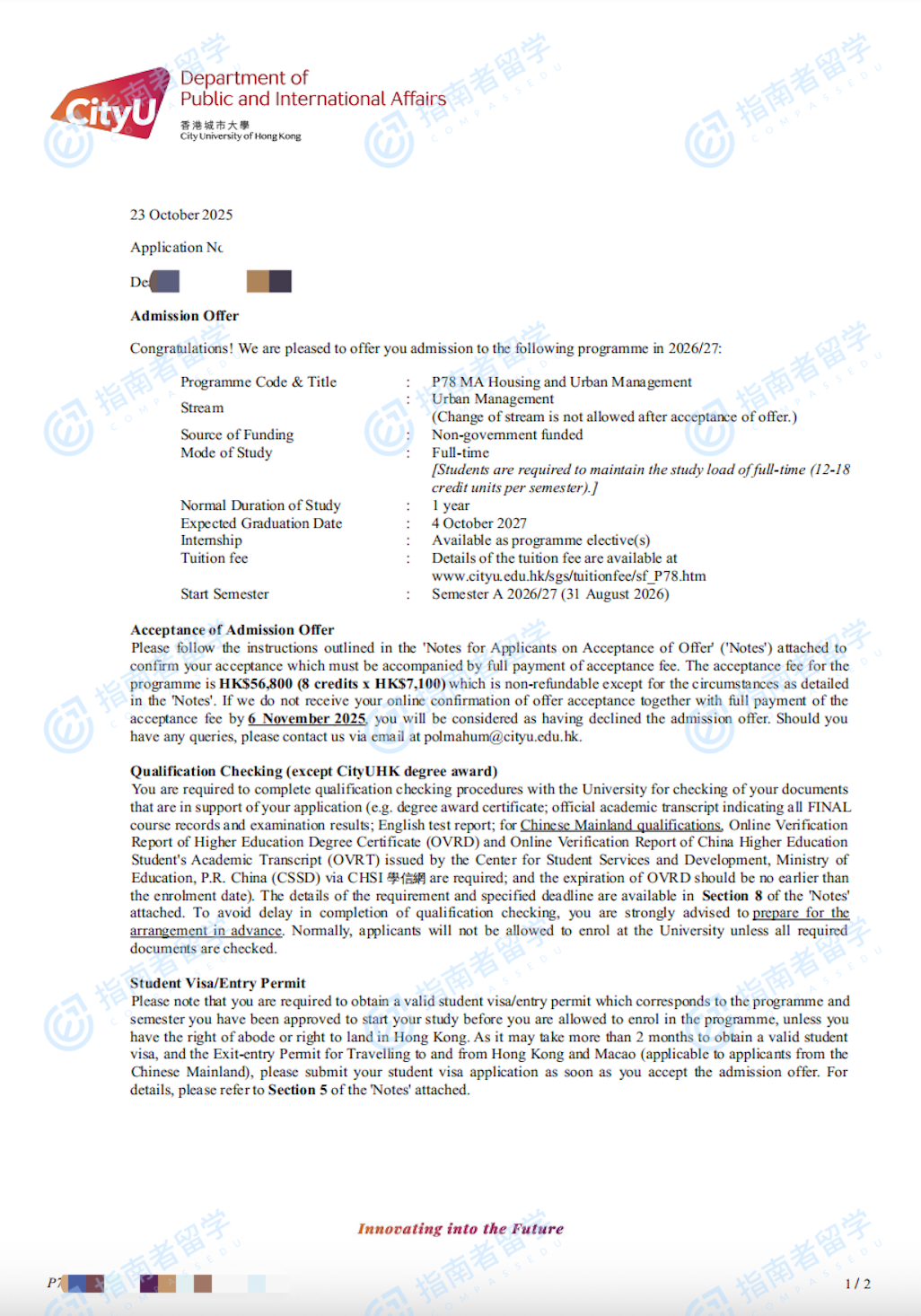 香港城市大學(xué)房屋及都市管理文學(xué)碩士研究生offer一枚