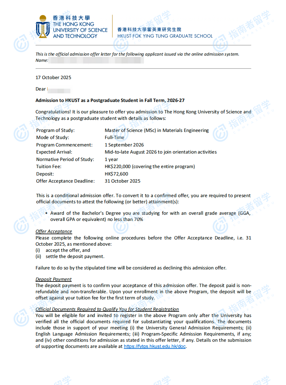 香港科技大學(xué)材料工程理學(xué)碩士研究生offer一枚