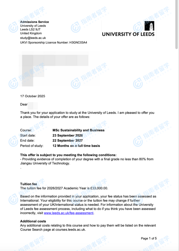利茲大學(xué)可持續(xù)發(fā)展與商業(yè)理學(xué)碩士研究生offer一枚