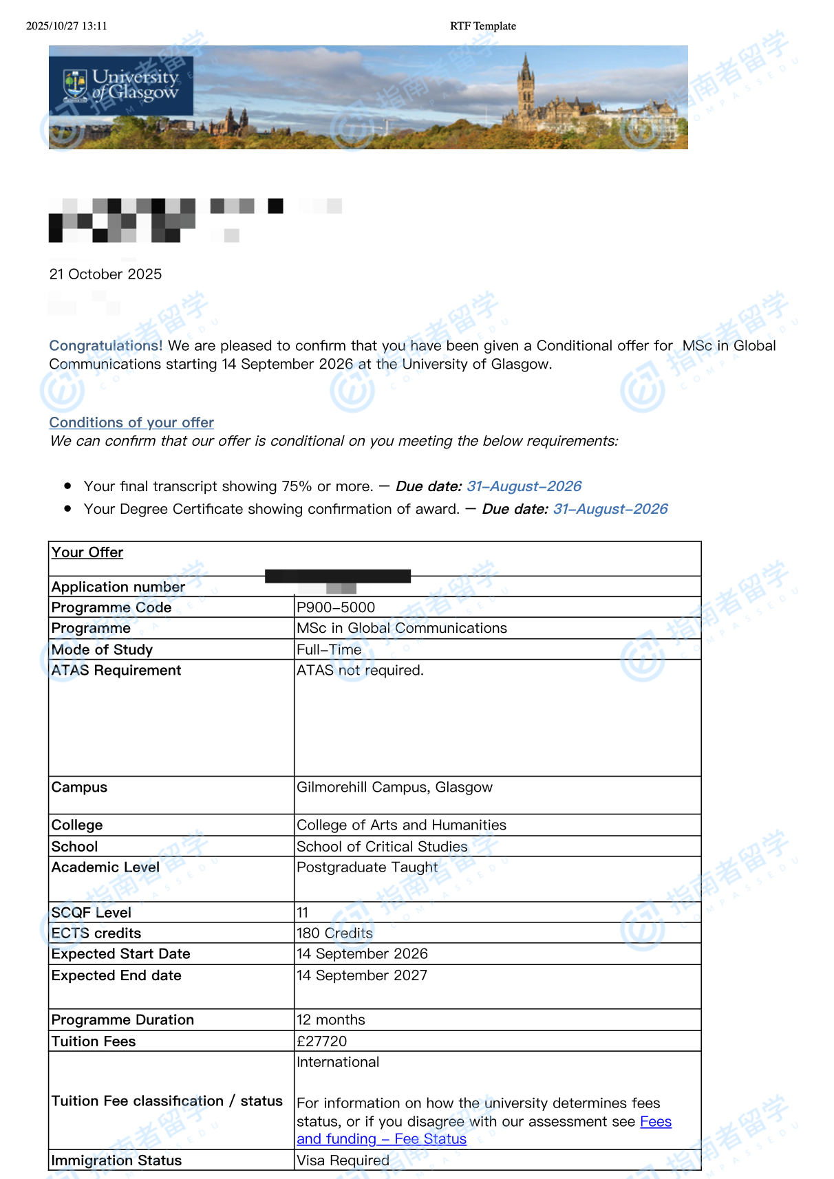 格拉斯哥大學(xué)全球傳播理學(xué)碩士研究生offer一枚