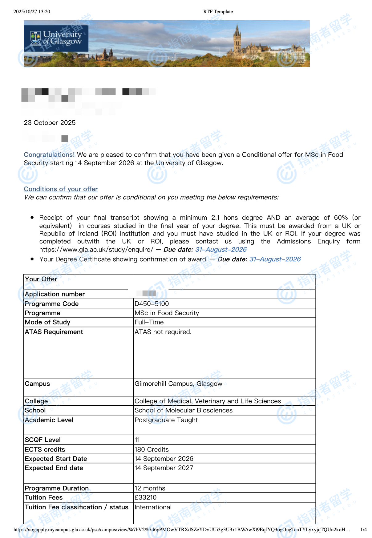格拉斯哥大學(xué)糧食安全理學(xué)碩士研究生offer一枚