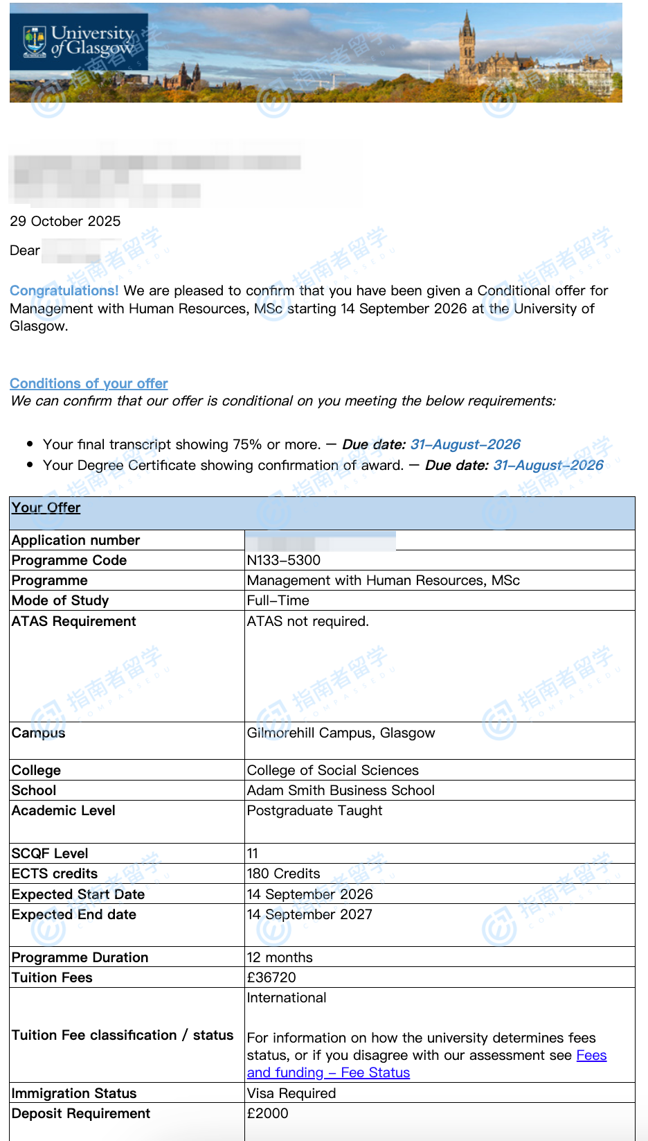 格拉斯哥大學(xué)管理學(xué)(人力資源)理學(xué)碩士研究生offer一枚