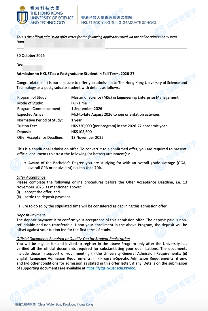 香港科技大學(xué)工程企業(yè)管理理學(xué)碩士研究生offer一枚