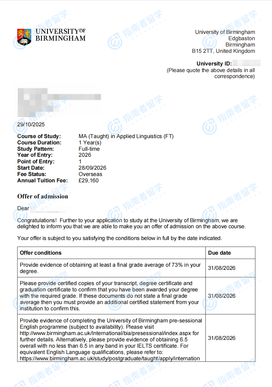 伯明翰大學應用語言學文學碩士研究生offer一枚