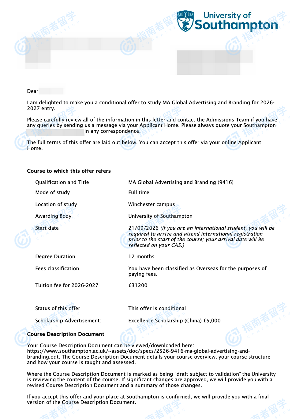 南安普頓大學(xué)全球廣告學(xué)與品牌文學(xué)碩士研究生offer一枚