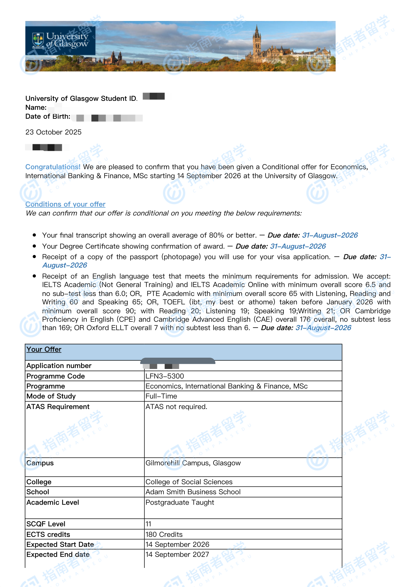 格拉斯哥大學經(jīng)濟、國際銀行與金融理學碩士研究生offer一枚