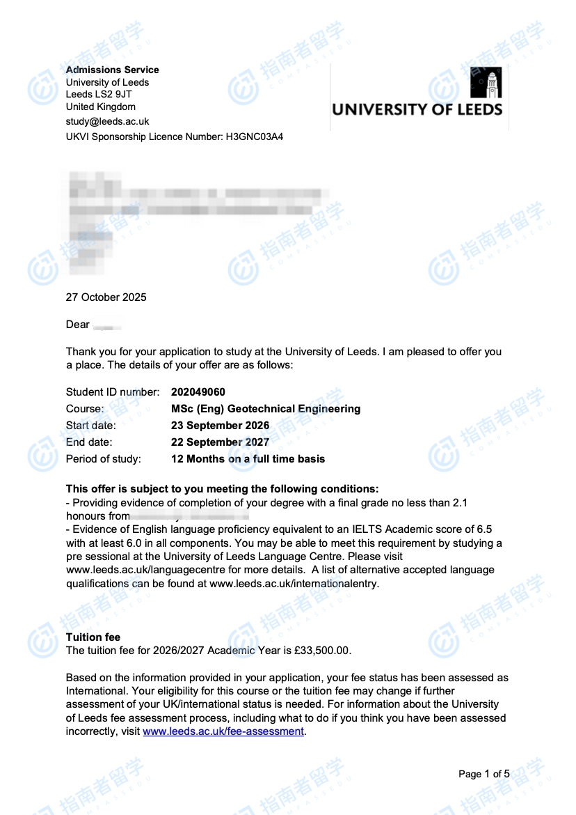 利茲大學巖土工程(工程)理學碩士研究生offer一枚