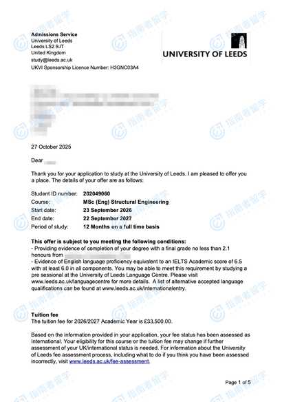 利茲大學(xué)結(jié)構(gòu)工程(工程)理學(xué)碩士研究生offer一枚