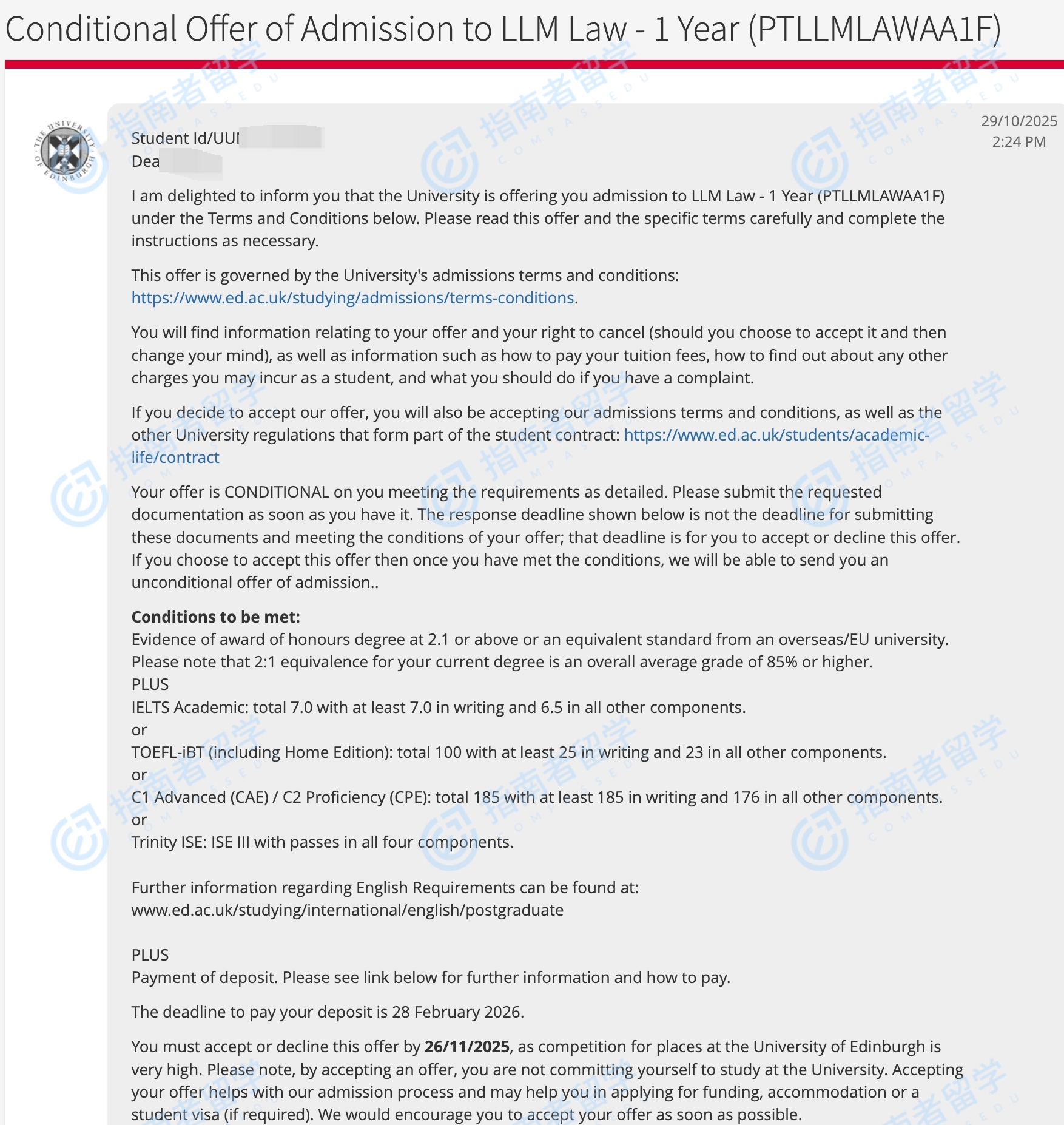 愛丁堡大學(xué)法學(xué)碩士研究生offer一枚