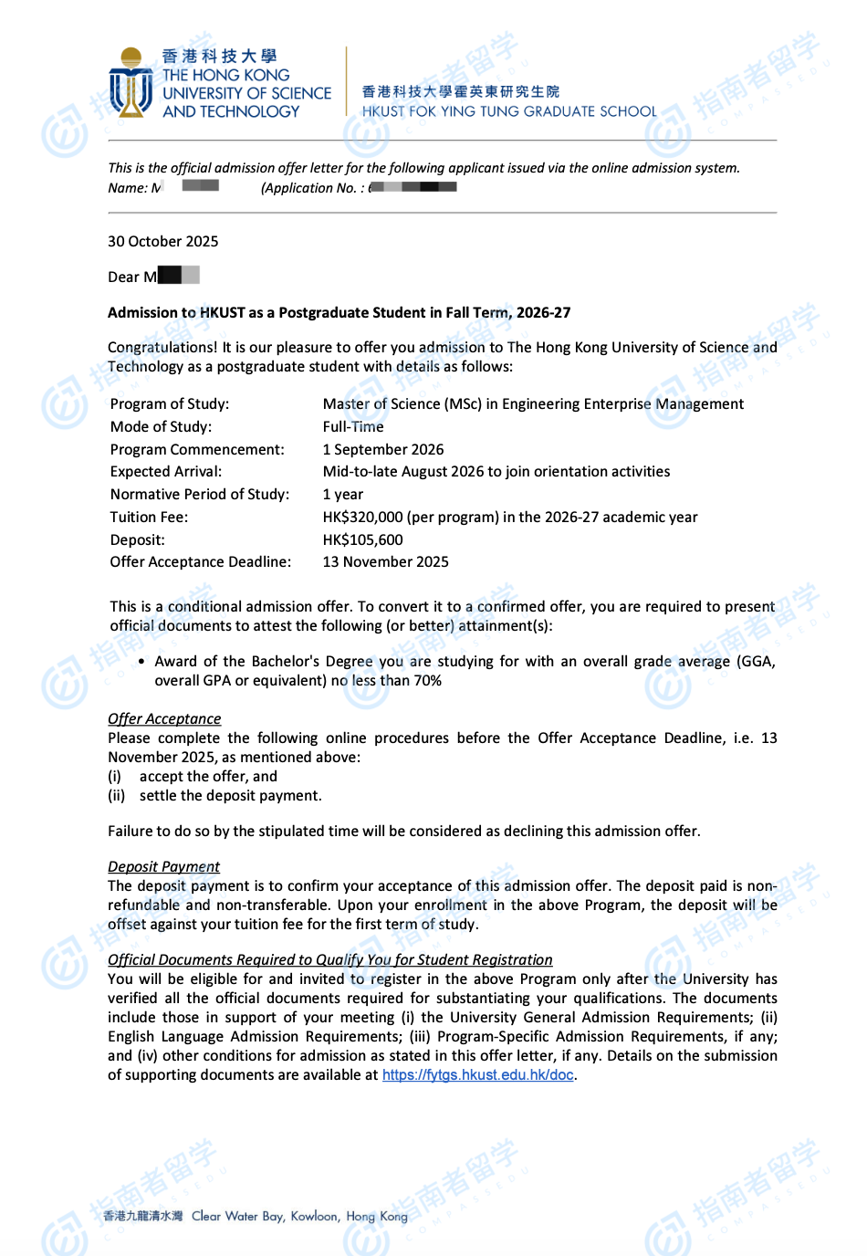 香港科技大學工程企業(yè)管理理學碩士研究生offer一枚