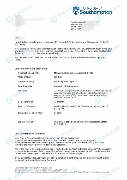南安普頓大學(xué)會計與管理理學(xué)碩士研究生offer一枚
