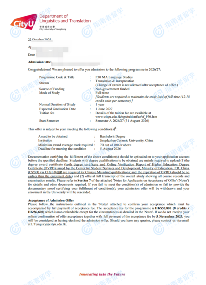香港城市大學(xué)語言研究文學(xué)碩士研究生offer一枚