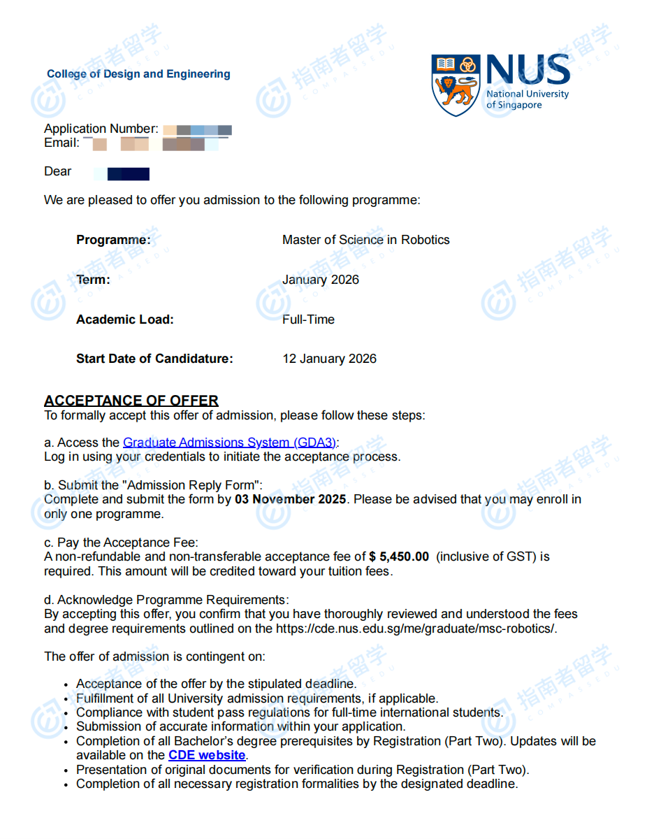 新加坡國立大學機器人學理學碩士研究生offer一枚