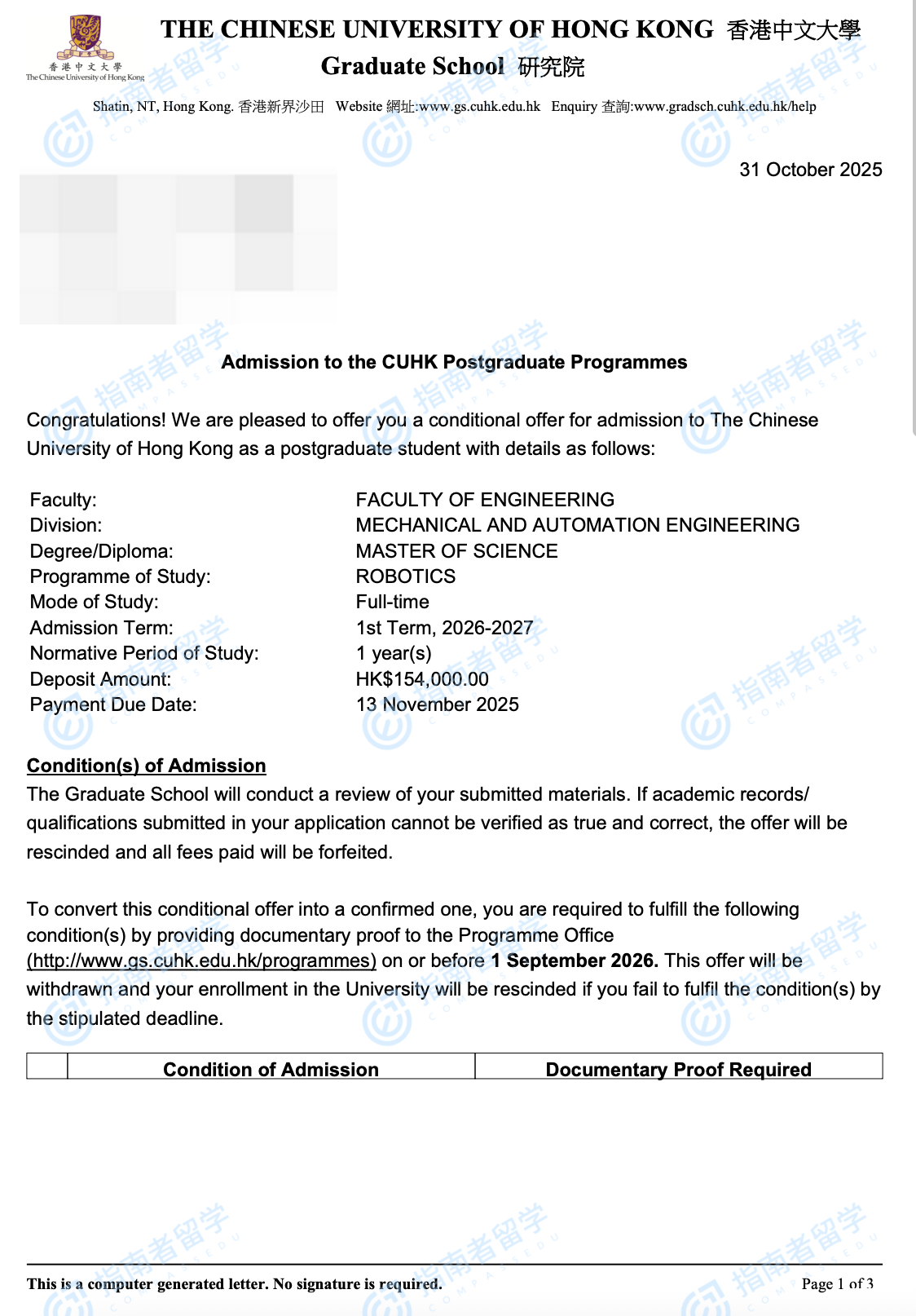 香港中文大學(xué)機器人學(xué)理學(xué)碩士研究生offer一枚