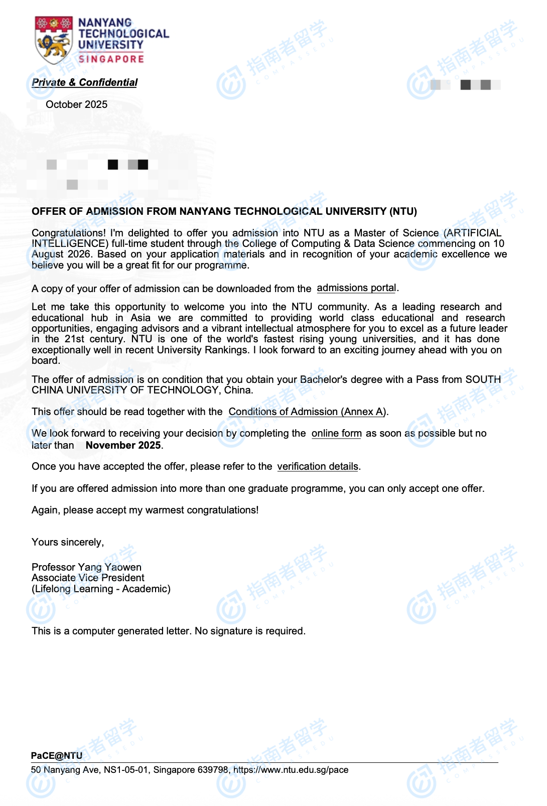 南洋理工大學(xué)人工智能理學(xué)碩士研究生offer一枚