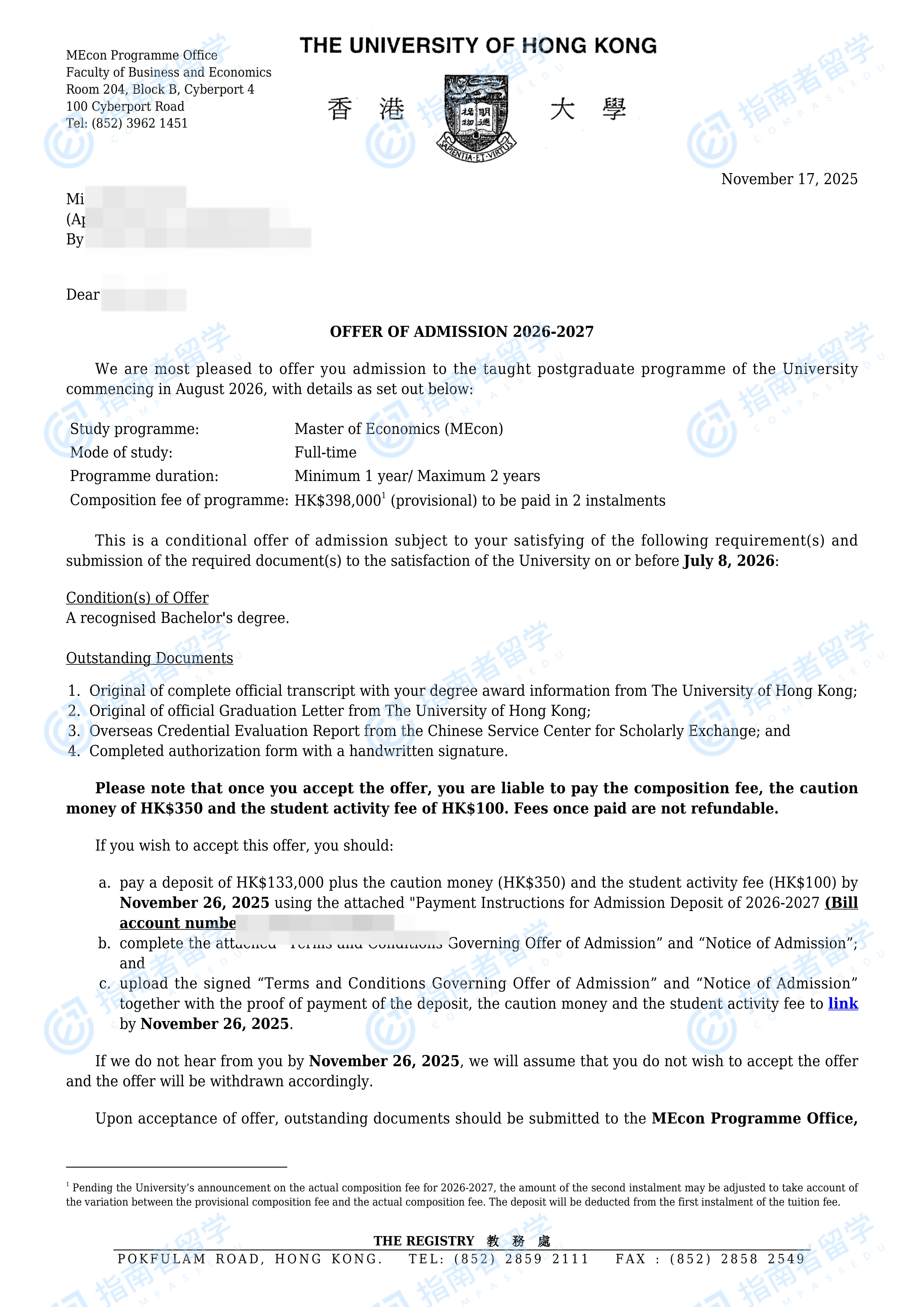 香港大學(xué)經(jīng)濟(jì)學(xué)碩士研究生offer一枚