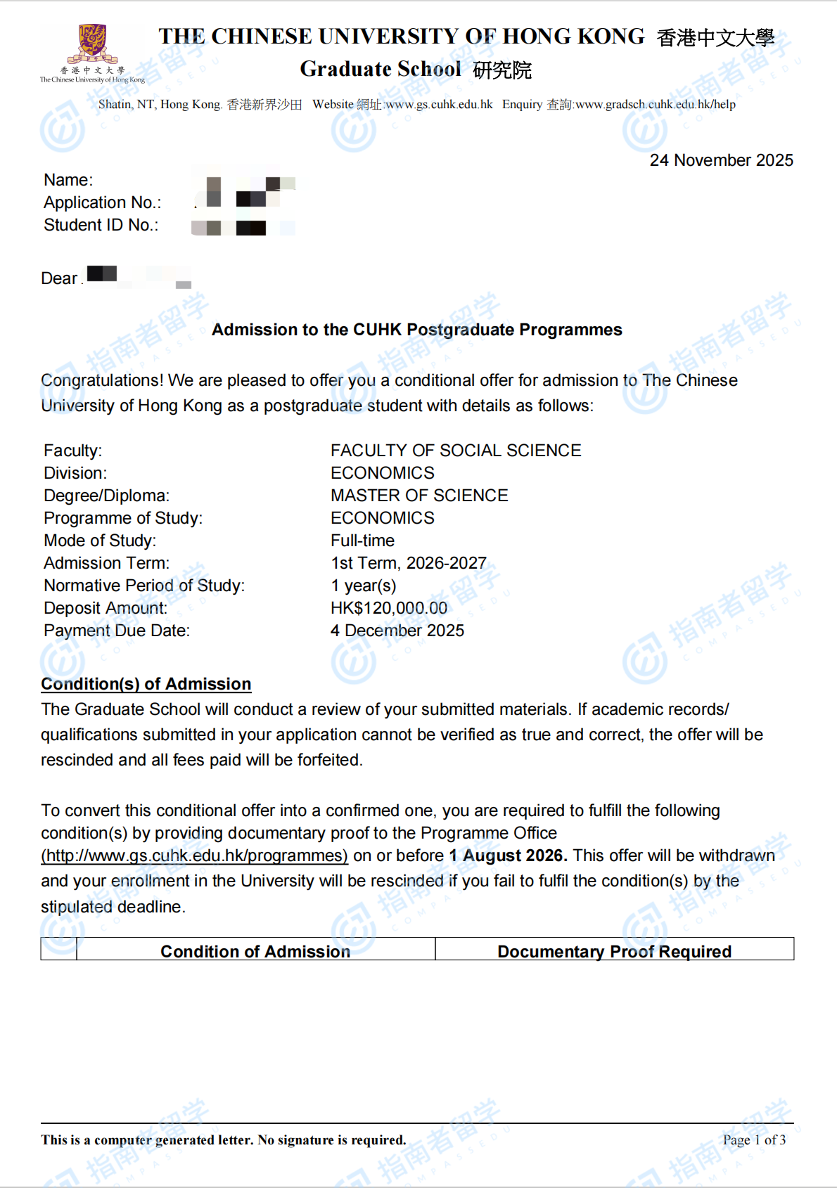 香港中文大學(xué)經(jīng)濟(jì)學(xué)理學(xué)碩士研究生offer一枚