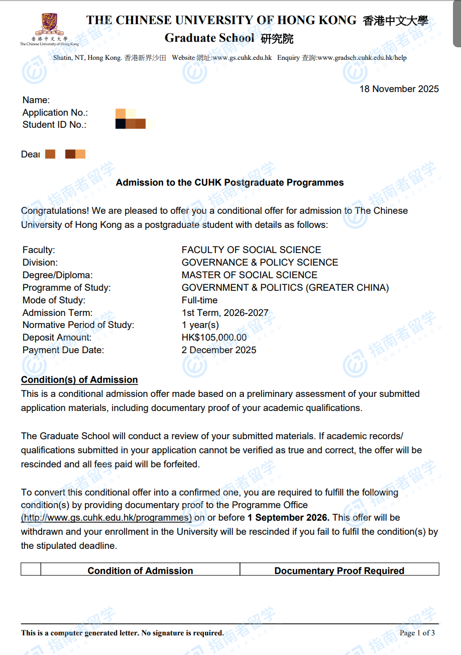 香港中文大學(xué)大中華地區(qū)的政府與政治社會(huì)科學(xué)碩士研究生offer一枚