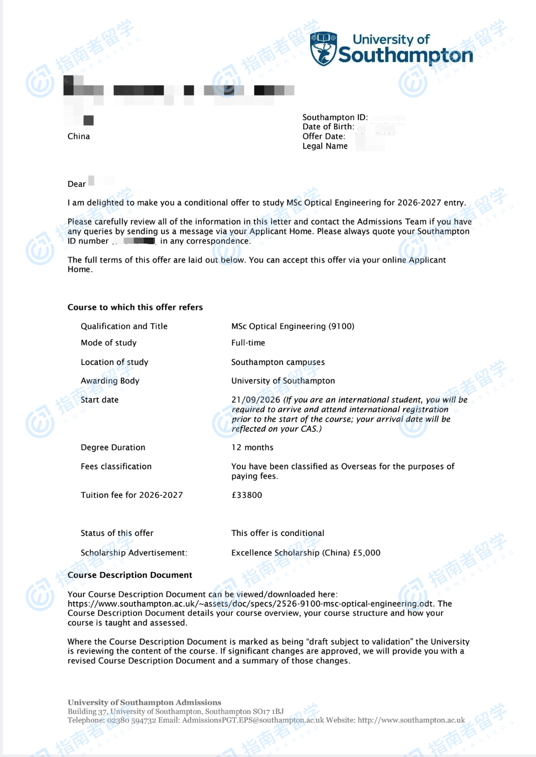 南安普頓大學(xué)光學(xué)工程理學(xué)碩士研究生offer一枚