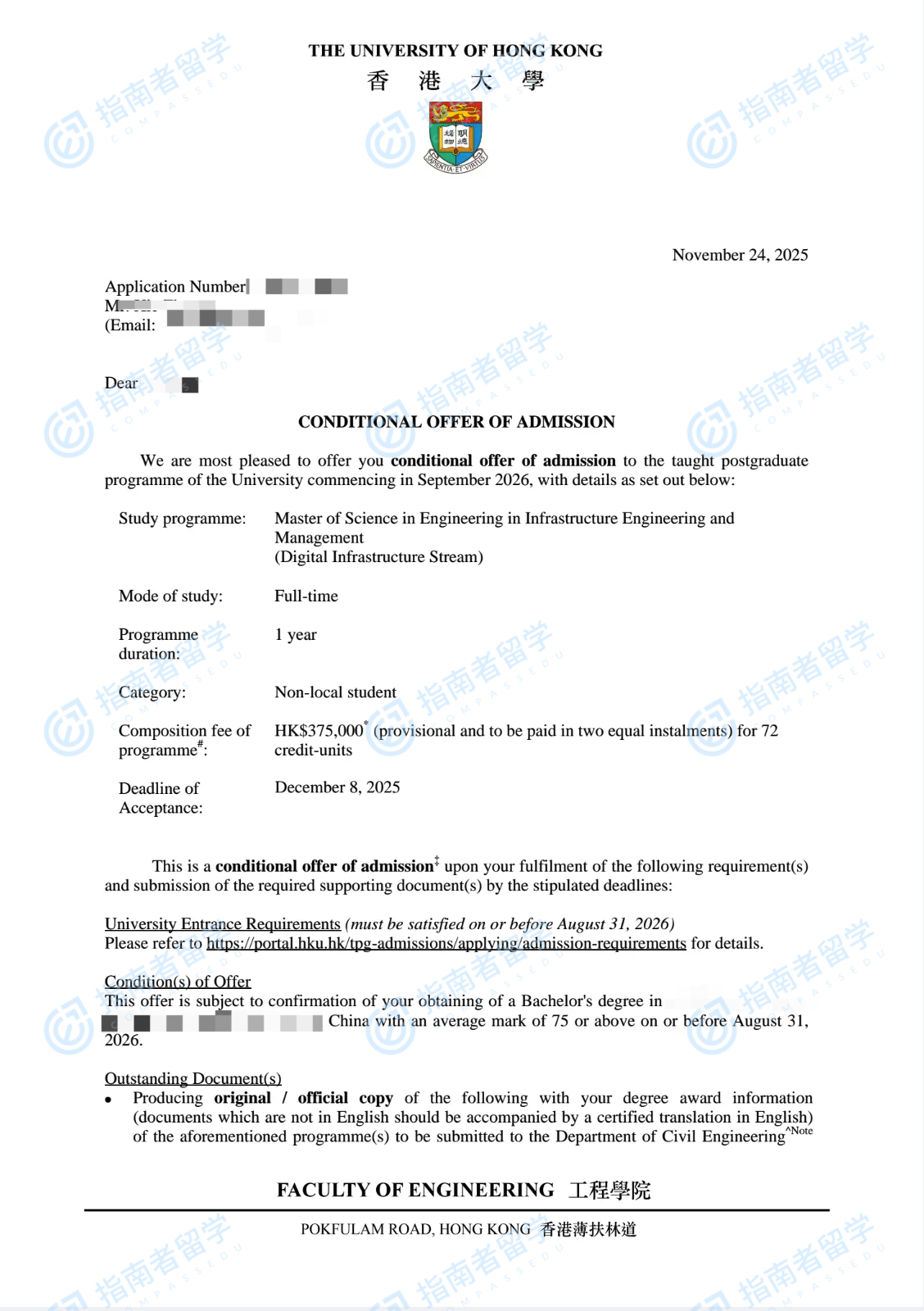 香港大學基礎(chǔ)設(shè)施工程與管理(工程)理學碩士 - 數(shù)字基礎(chǔ)設(shè)施方向研究生offer一枚