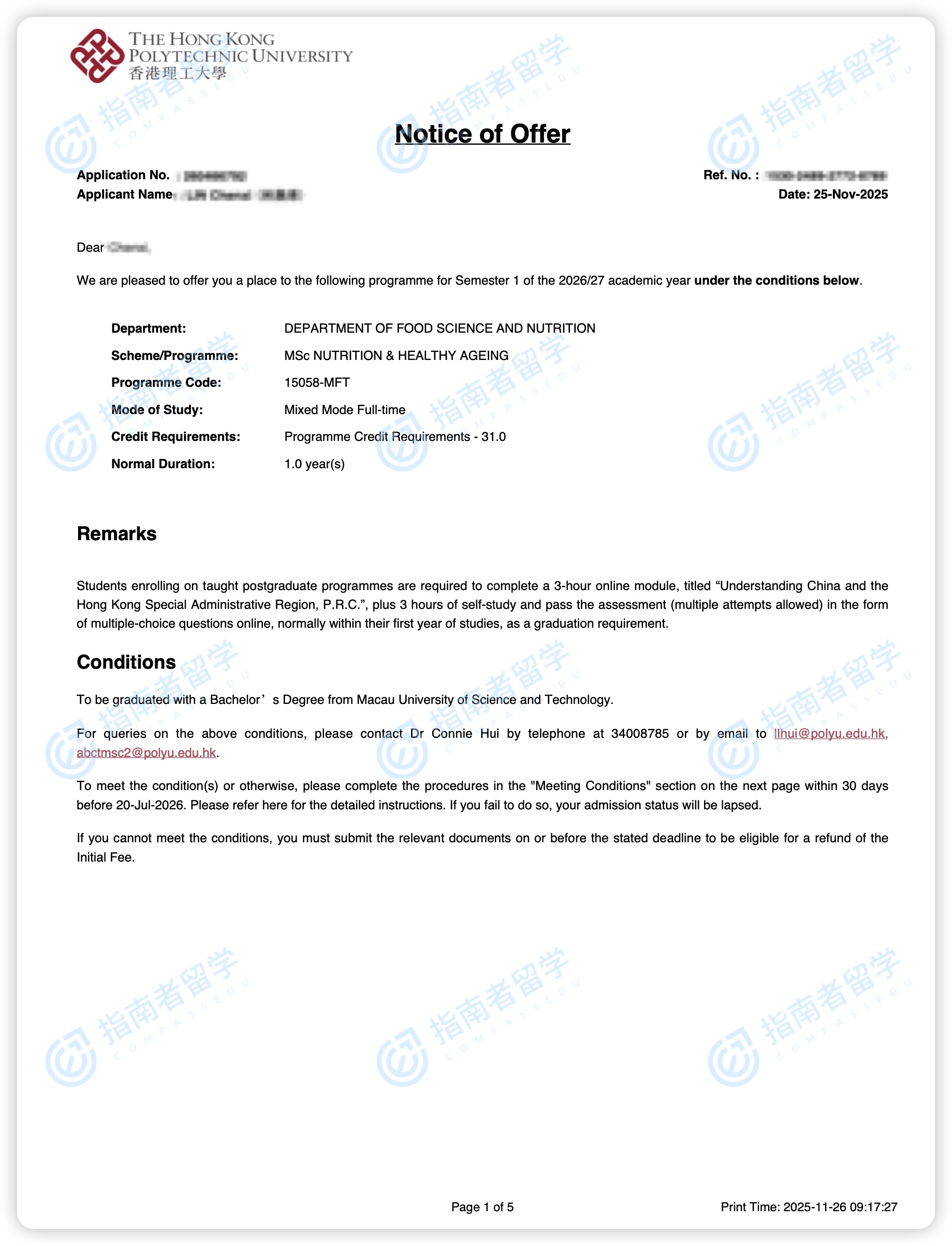 香港理工大學(xué)營養(yǎng)與健康活齡理學(xué)碩士研究生offer一枚