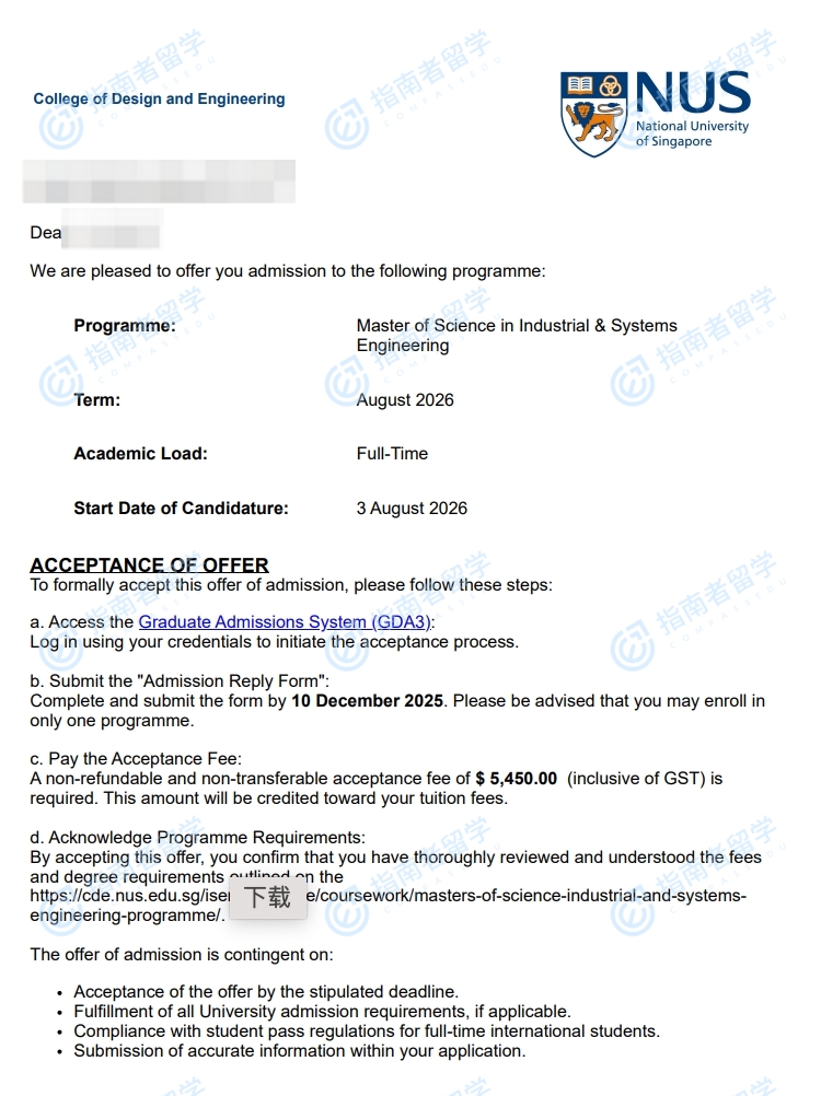 新加坡國立大學工業(yè)與系統(tǒng)工程理學碩士研究生offer一枚