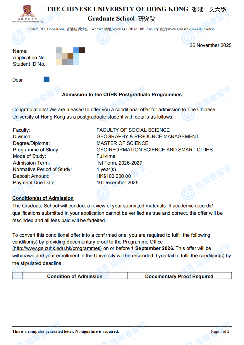 香港中文大學(xué)地理信息科學(xué)與智慧城市理學(xué)碩士研究生offer一枚