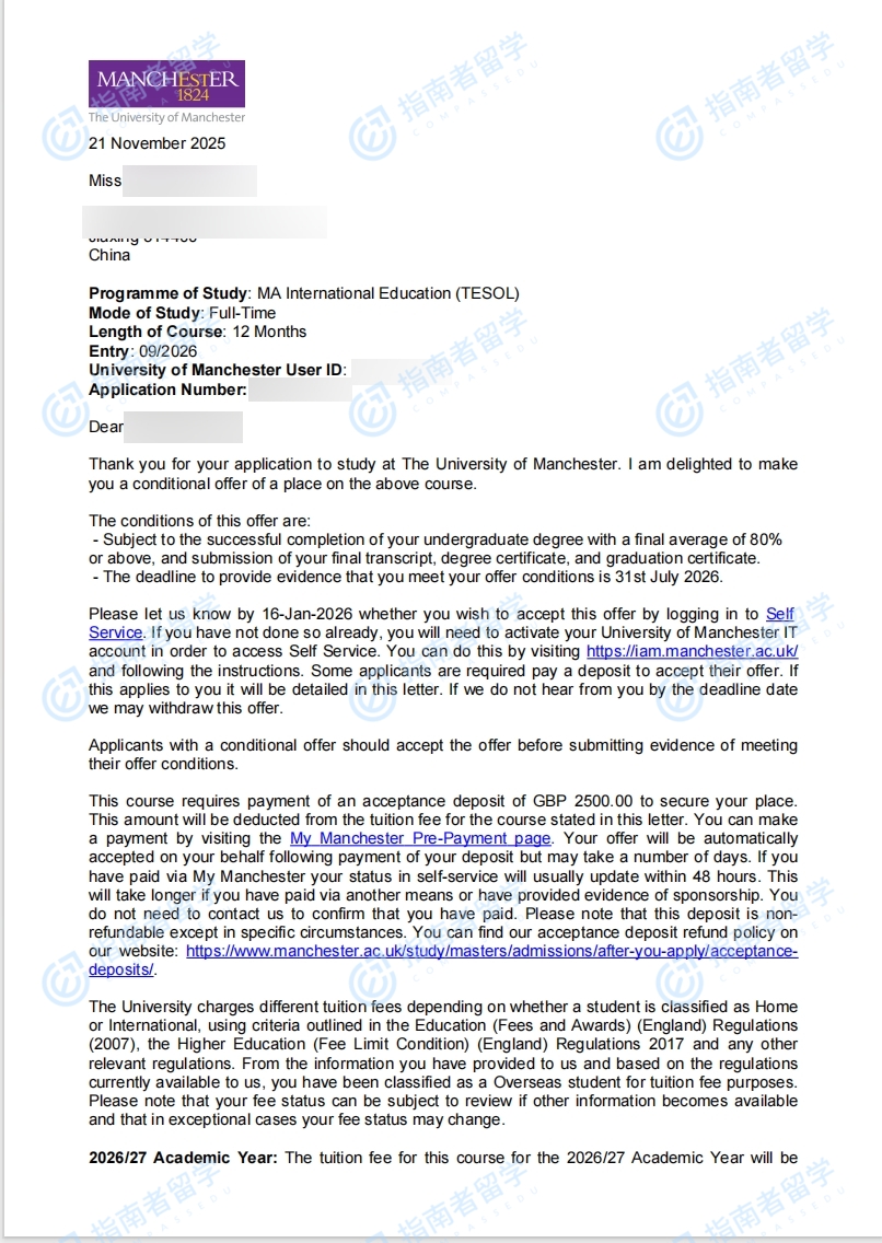 曼徹斯特大學(xué)國(guó)際教育(對(duì)外英語教學(xué))文學(xué)碩士研究生offer一枚