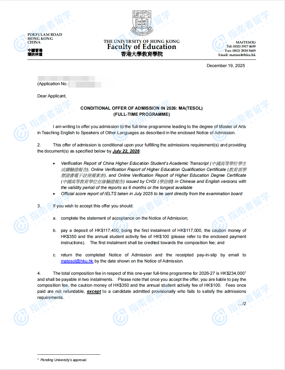 香港大學對外英語教學文學碩士研究生offer一枚