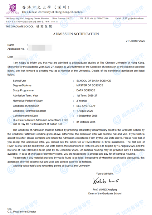 香港中文大學(xué)數(shù)據(jù)科學(xué)理學(xué)碩士(CUHK-Shenzhen)研究生offer一枚