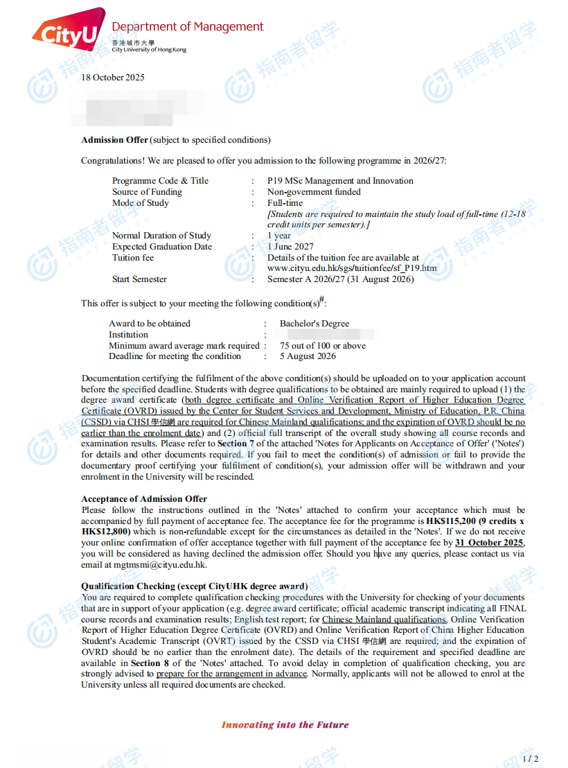 香港城市大學(xué)管理與創(chuàng)新理學(xué)碩士研究生offer一枚