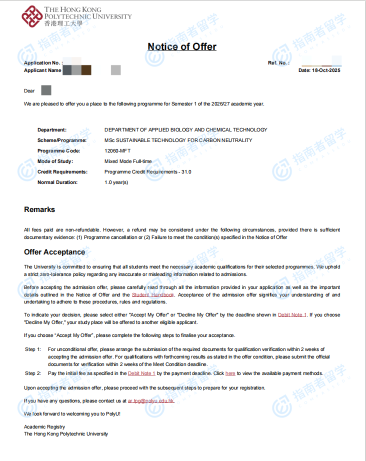 香港理工大學(xué)碳中和可持續(xù)科技理學(xué)碩士研究生offer一枚
