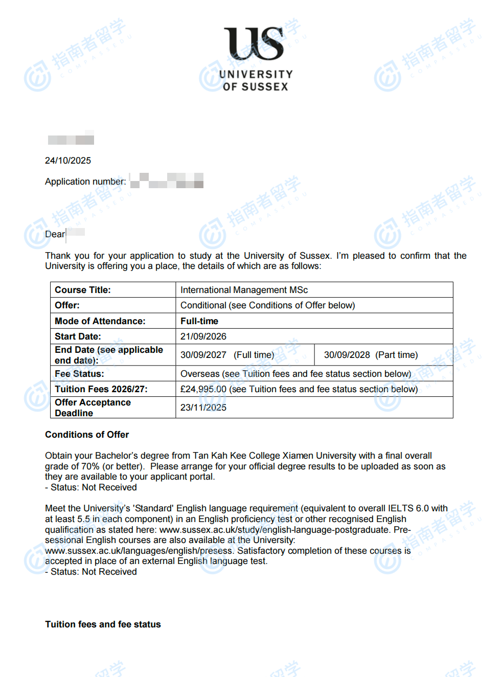 薩塞克斯大學(xué)國際管理理學(xué)碩士研究生offer一枚