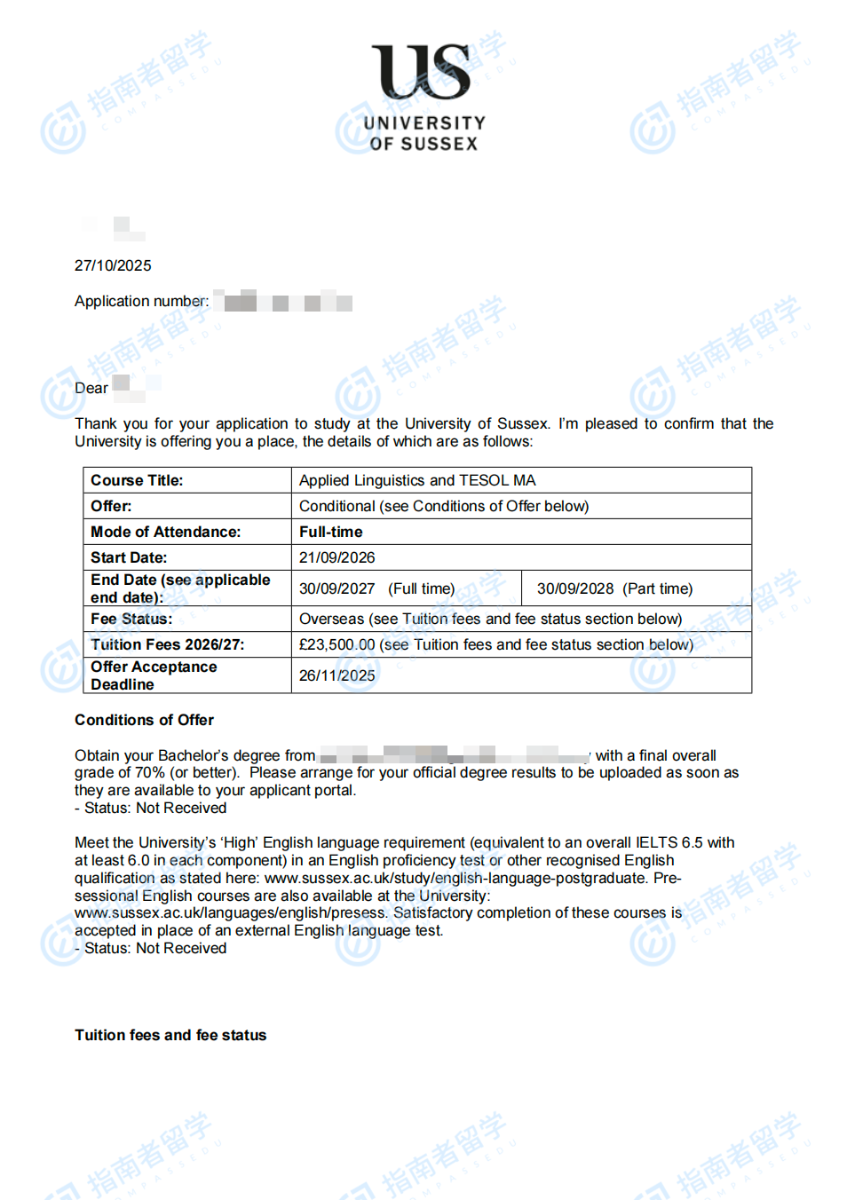 薩塞克斯大學(xué)應(yīng)用語言學(xué)與對外英語教學(xué)文學(xué)碩士研究生offer一枚