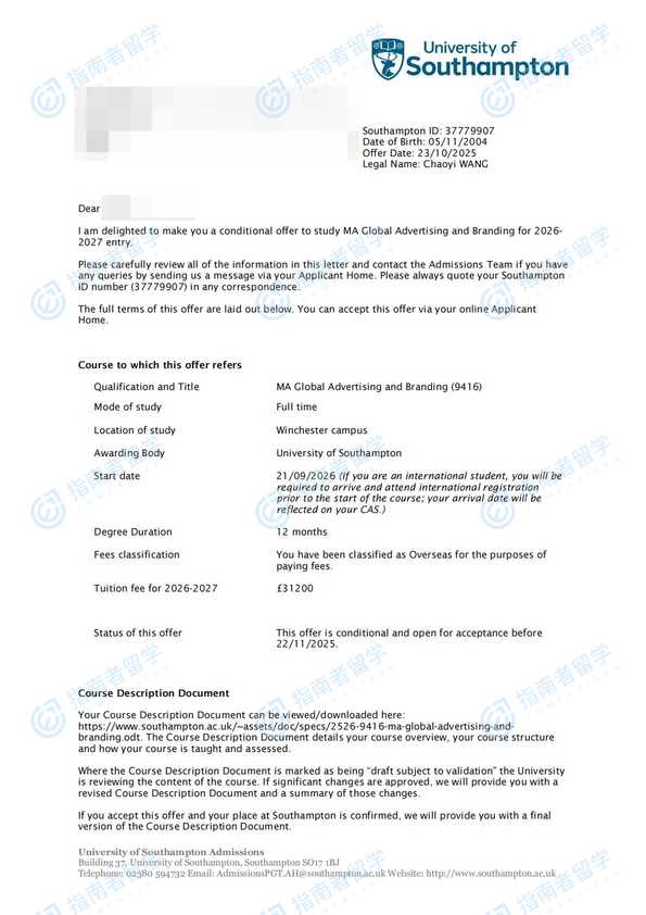 南安普頓大學(xué)全球廣告學(xué)與品牌文學(xué)碩士研究生offer一枚