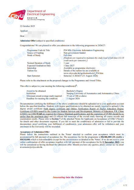 香港城市大學(xué)電子資訊工程學(xué)理學(xué)碩士研究生offer一枚