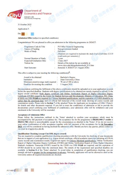 香港城市大學(xué)金融工程學(xué)理學(xué)碩士研究生offer一枚