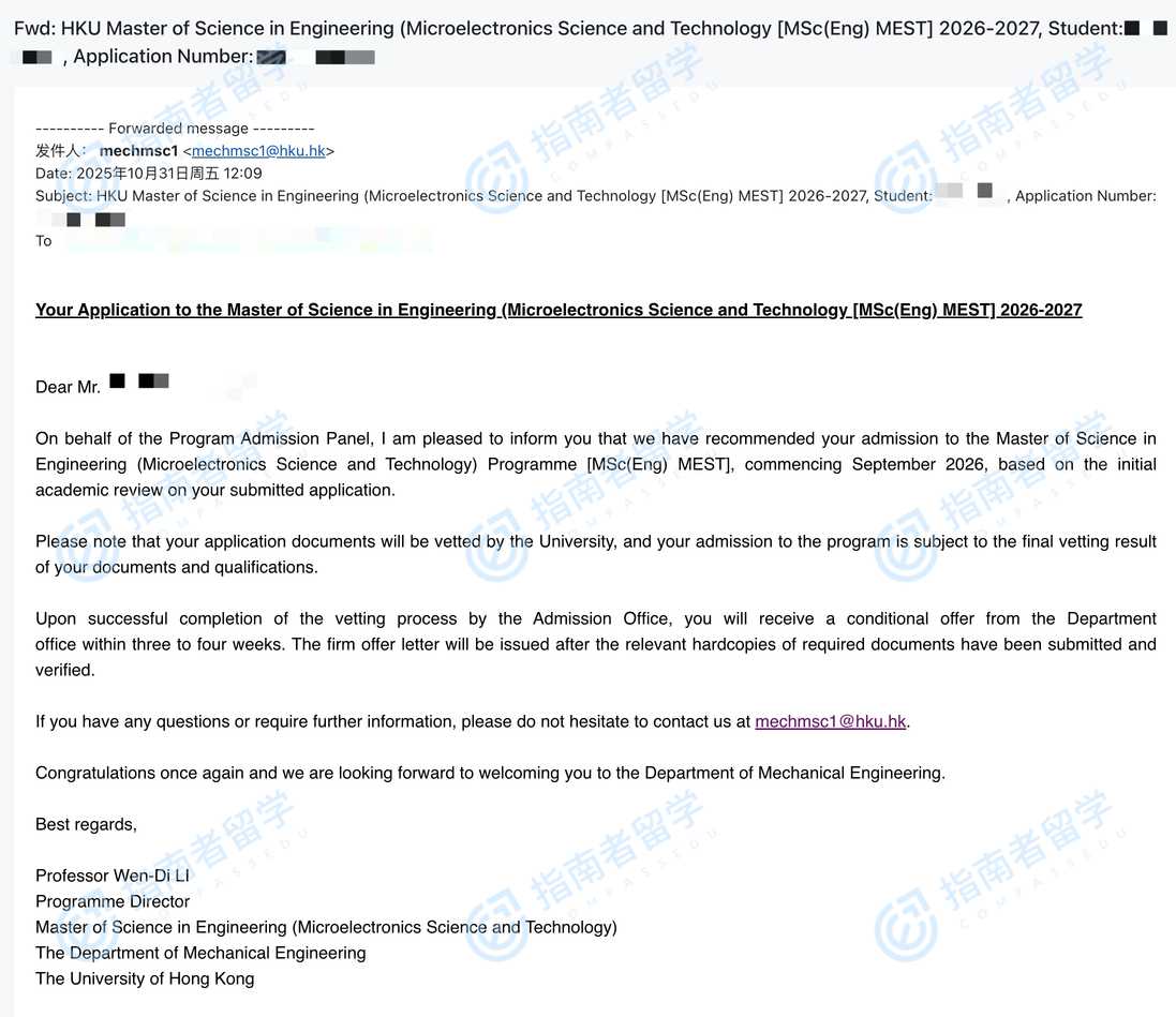 香港大學(xué)微電子科學(xué)與技術(shù)(工程)理學(xué)碩士研究生offer一枚