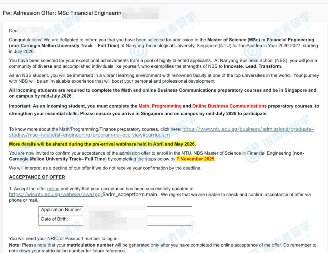 南洋理工大學(xué)金融工程理學(xué)碩士研究生offer一枚