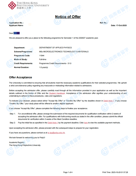 香港理工大學(xué)微電子技術(shù)與材料理學(xué)碩士研究生offer一枚