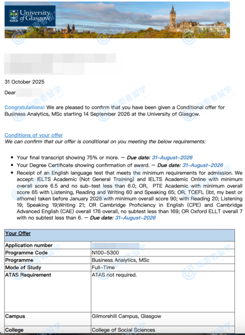 格拉斯哥大學(xué)商業(yè)分析理學(xué)碩士研究生offer一枚