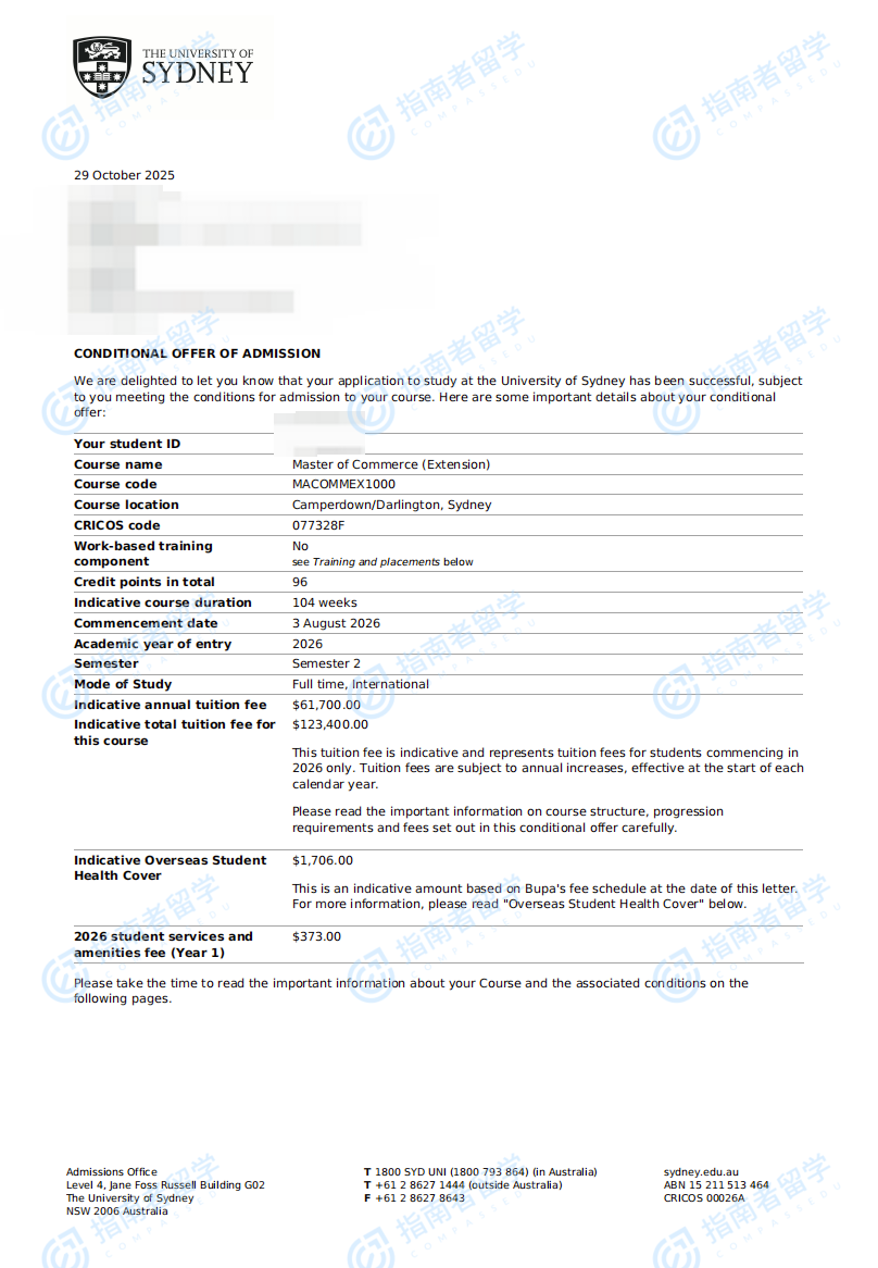 悉尼大學(xué)商學(xué)碩士(擴(kuò)展課程)研究生offer一枚