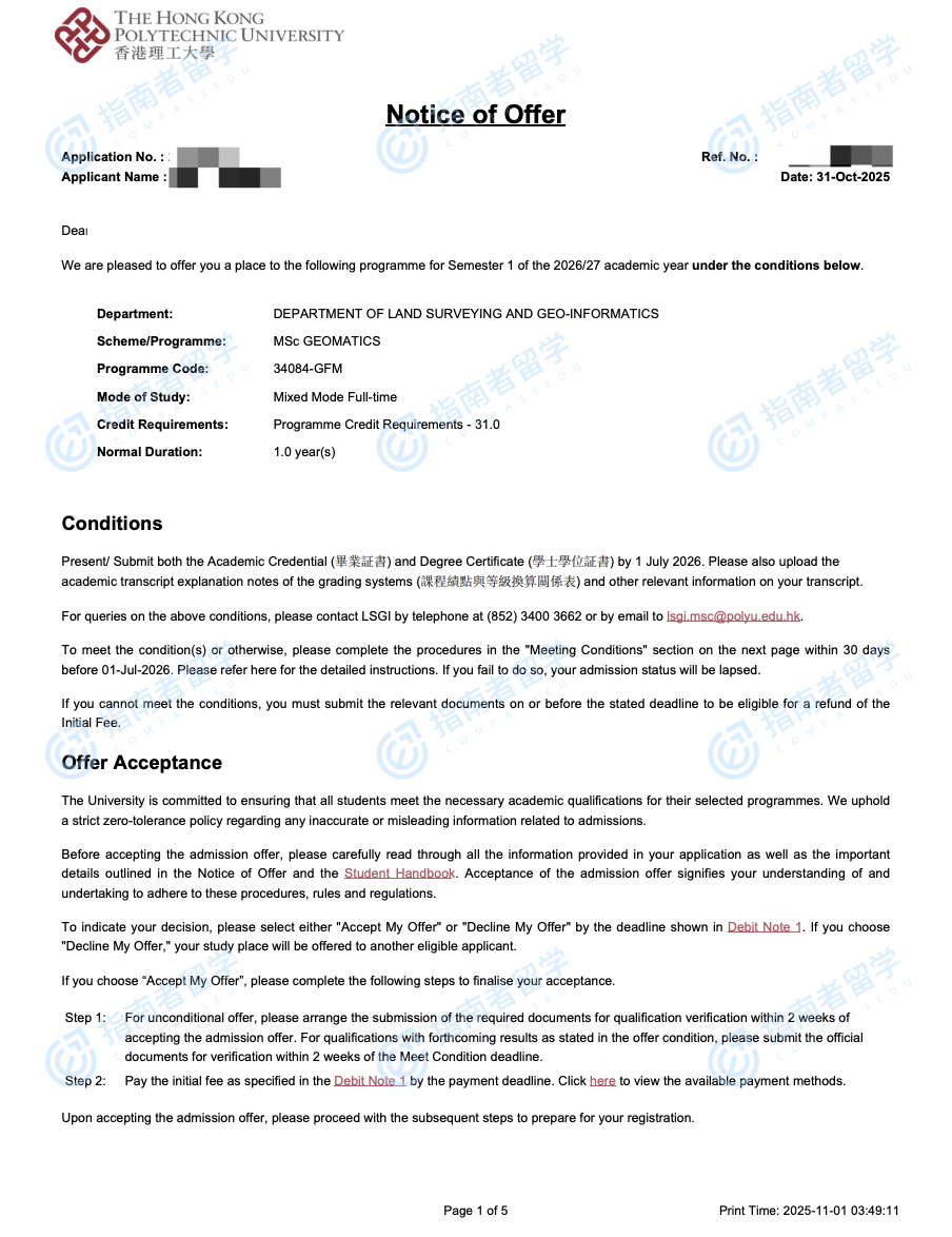 香港理工大學(xué)測(cè)繪及地理資訊學(xué)理學(xué)碩士研究生offer一枚