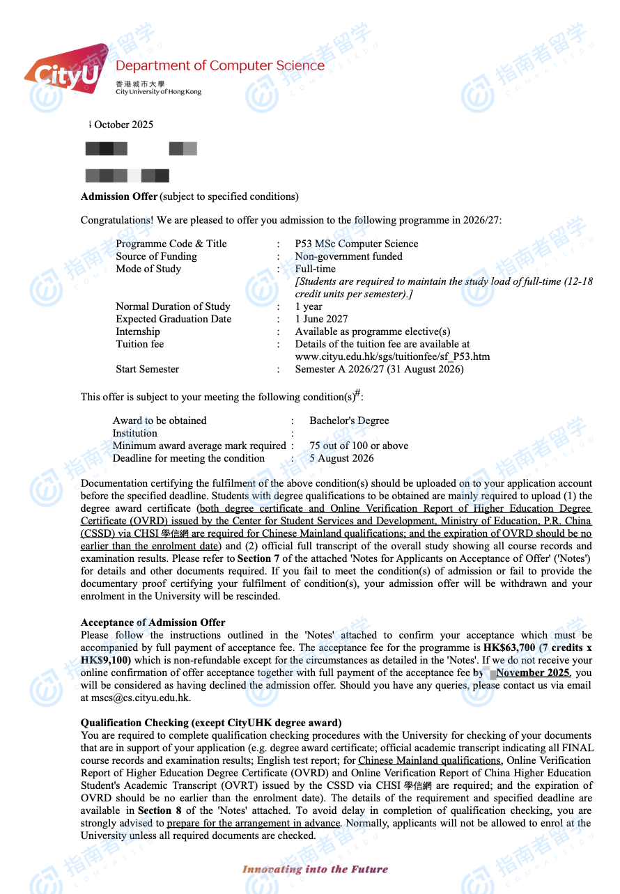香港城市大學(xué)計算機(jī)科學(xué)理學(xué)碩士研究生offer一枚