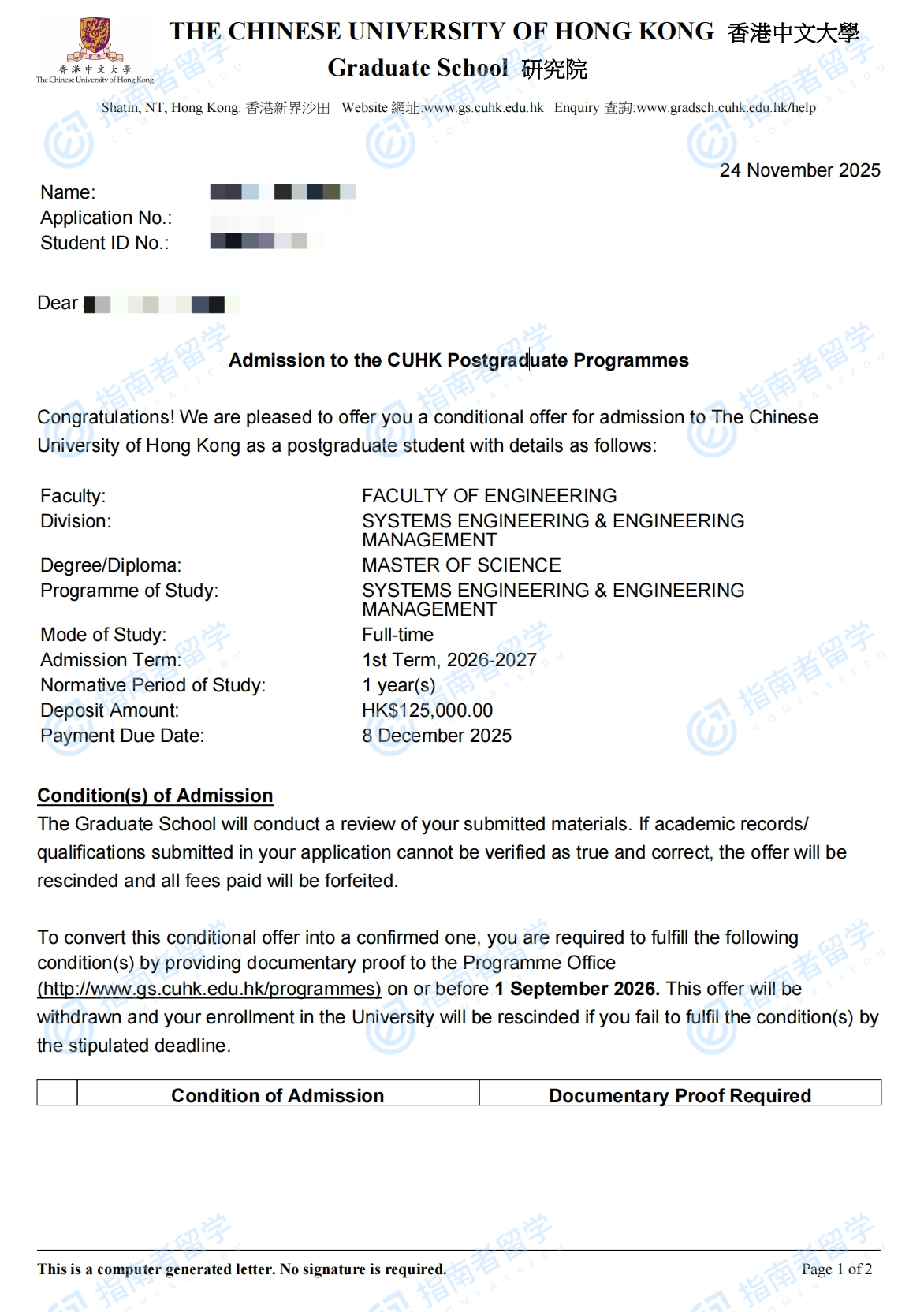 香港中文大學(xué)系統(tǒng)工程與工程管理理學(xué)碩士研究生offer一枚