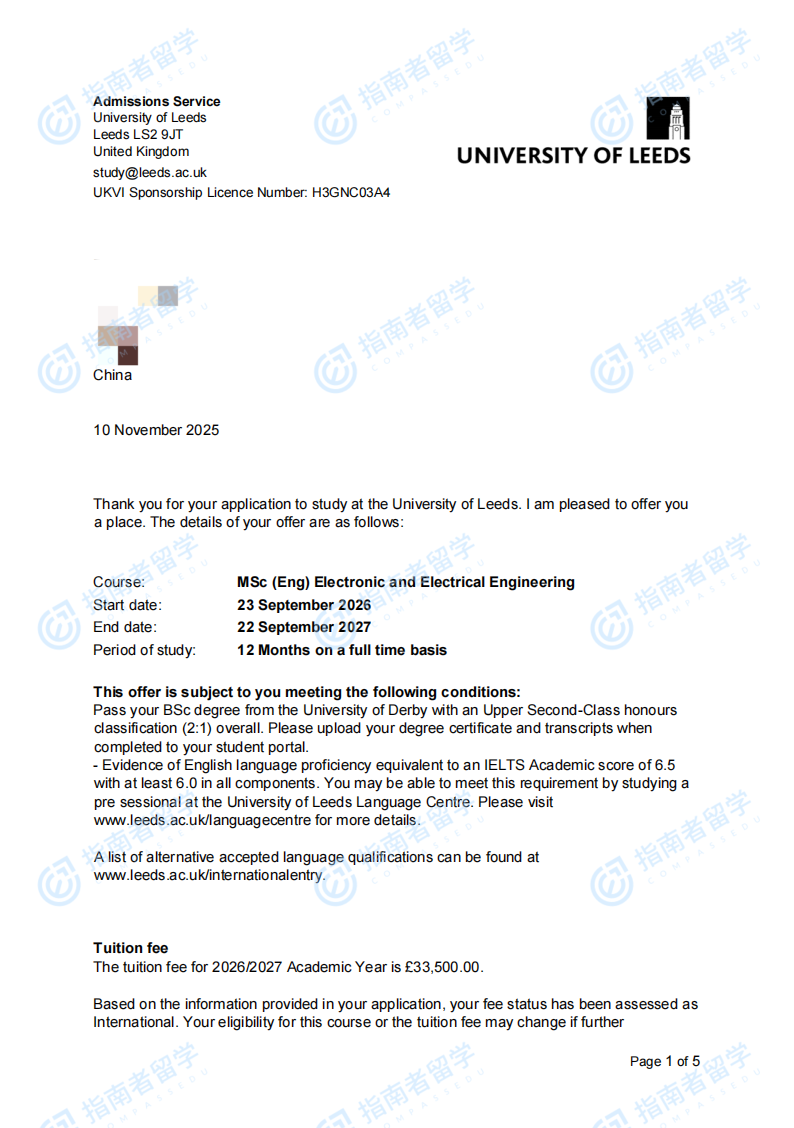 利茲大學(xué)電子與電氣工程(工程)理學(xué)碩士研究生offer一枚